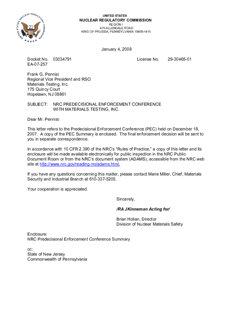 Get the free NRC Predecisional Enforcement Conference with Materials Testing, Inc.