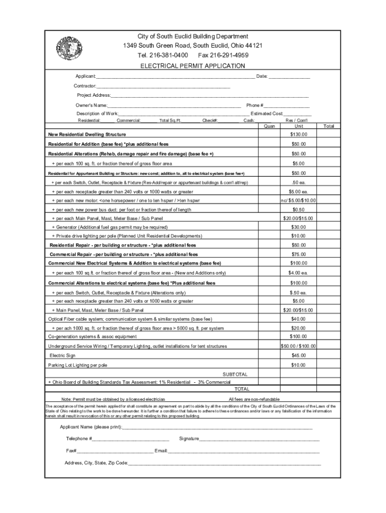 City of South Euclid Building Department 1349 South Green Road, South Euclid, Ohio 44121 Tel. 2163810400Fax 2162914959ELECTRICAL PERMIT APPLICATION Applicant:___ Date: ___ Contractor:___ Project Address:___