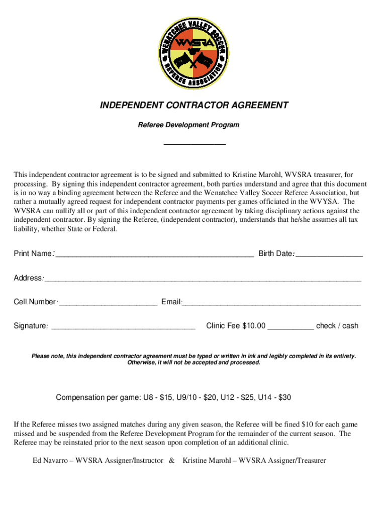INDEPENDENT CONTRACTOR AGREEMENT Referee Development Program ___This independent contractor agreement is to be signed and submitted to Kristine March, WV SRA treasurer, for processing. By signing