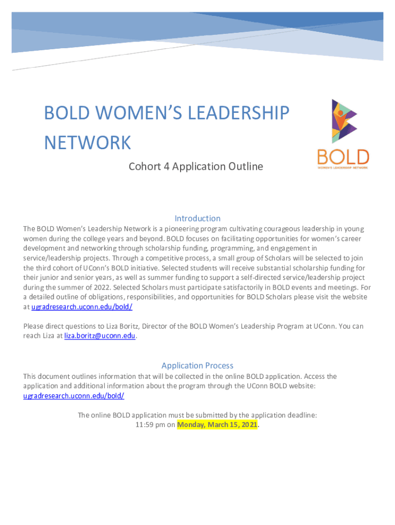 Get the free BOLD WOmens Leadership Network. Cohort 4 Application Outline - ugradresearch uconn