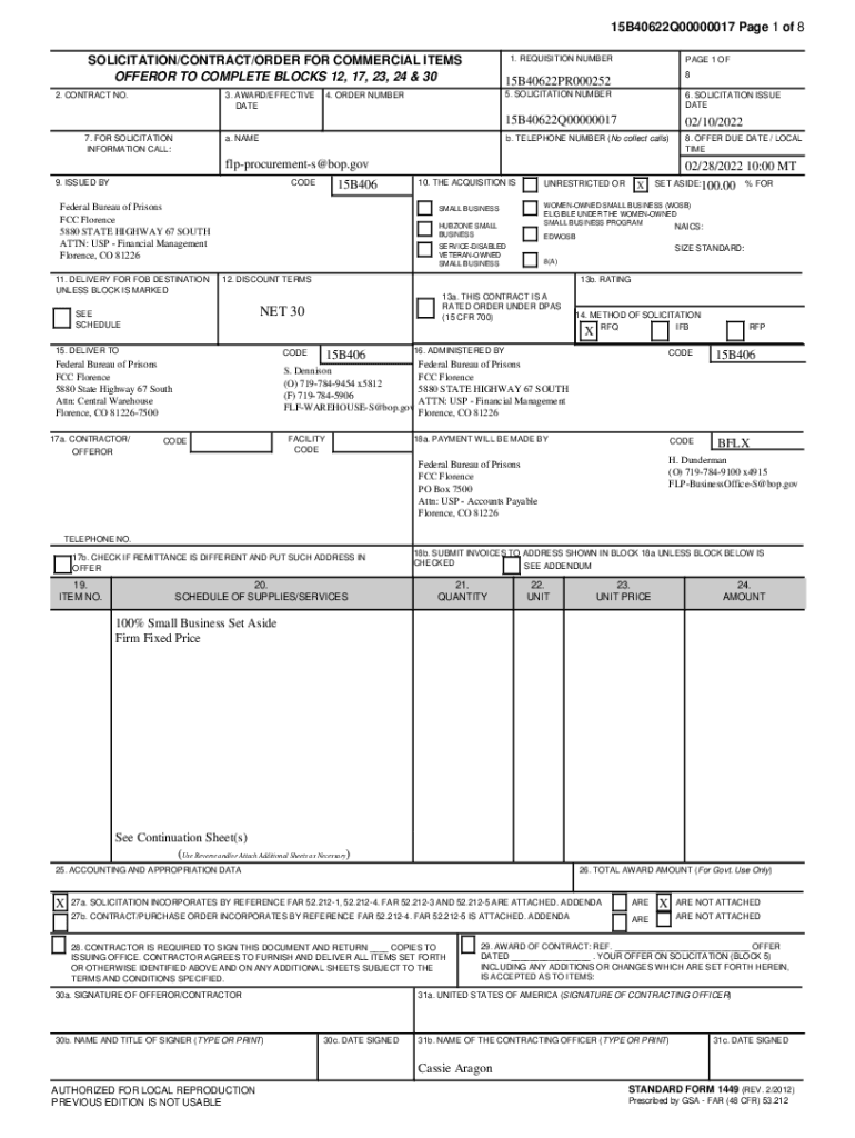 15B40622Q00000017 Page 1 of 8 1. REQUISITION NUMBERSOLICITATION/CONTRACT/ORDER FOR COMMERCIAL ITEMS OFFER OR TO COMPLETE BLOCKS 12, 17, 23, 24 & 30 2. CONTRACT NO.3. AWARD/EFFECTIVE DATE7. FOR SOLICITATION