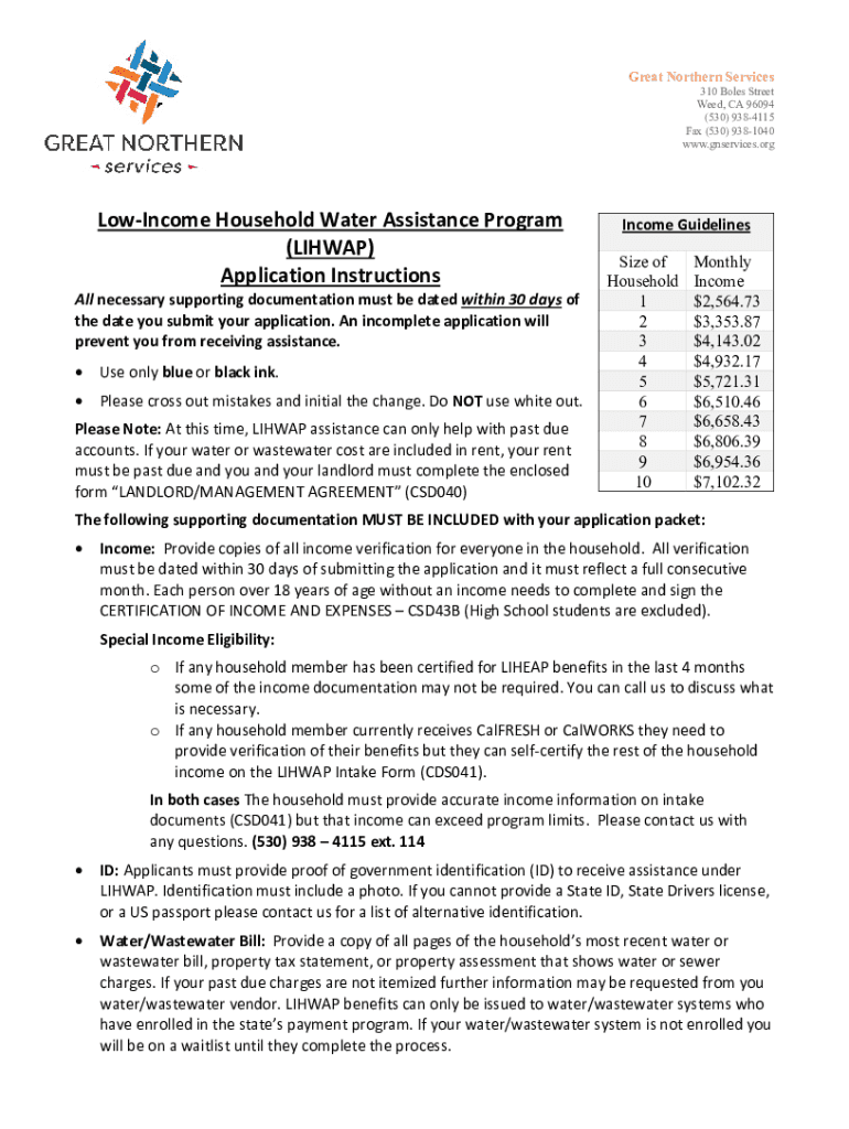 Great Northern Services310 Boles Street Weed, CA 96094 (530) 9384115 Fax (530) 9381040 www.gnservices.orgLowIncome Household Water Assistance Program (LIH WAP) Application Instructional necessary