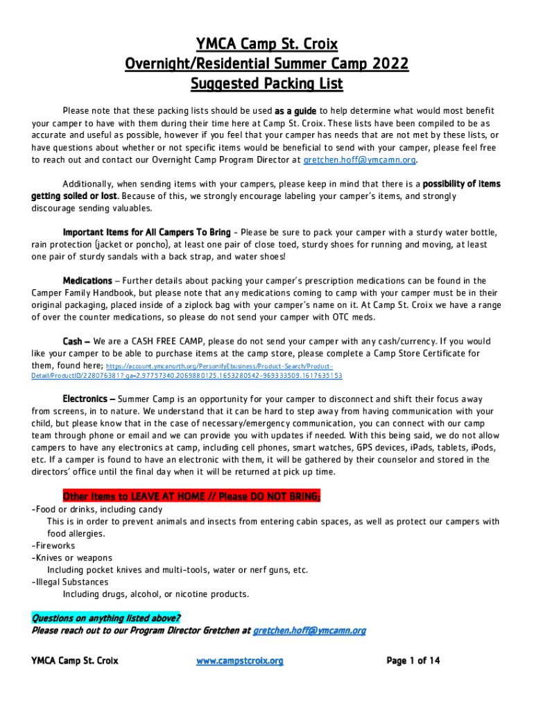 YMCA Camp St. Croix Overnight/Residential Summer Camp 2022 Suggested Packing List Please note that these packing lists should be used as a guide to help determine what would most benefit your camper