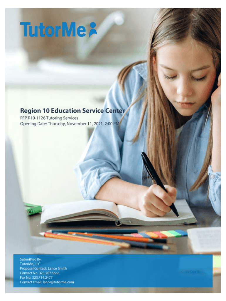 Region 10 Education Service Center RFP R101126 Tutoring Services Opening Date: Thursday, November 11, 2021, 2:00 Submitted By: Tutor Me, LLC Proposal Contact: Lance Smith Contact No. 323.207.5665