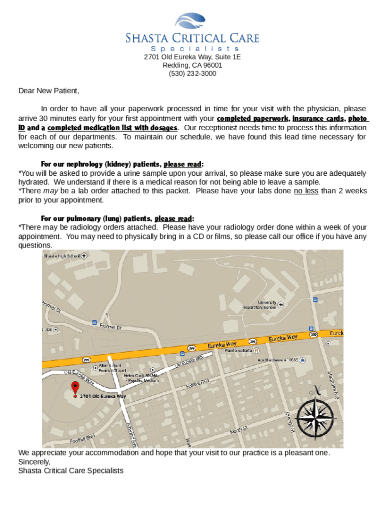 2701 Old Eureka Way, Suite 1E Redding, CA 96001 (530) 2323000Dear New Patient, In order to have all your paperwork processed in time for your visit with the physician, please arrive 30 minutes early