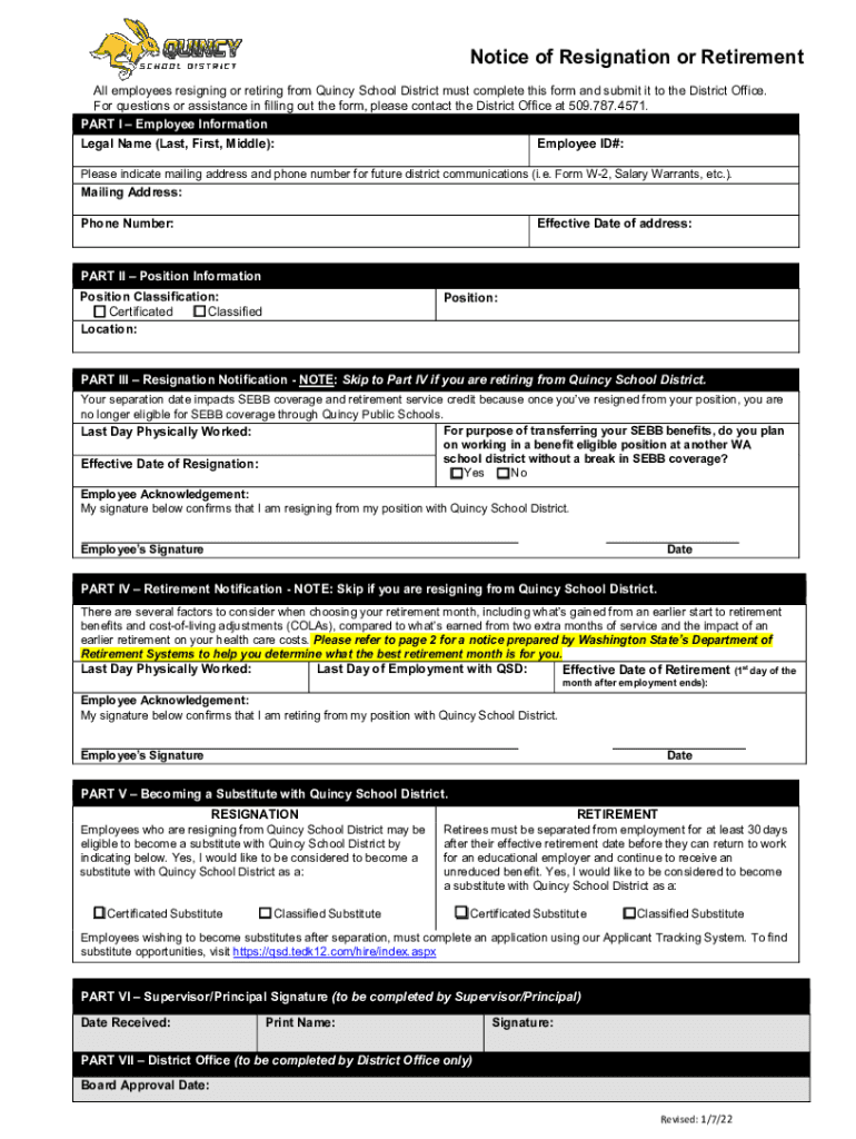 Notice of Resignation or Retirement All employees resigning or retiring from Quincy School District must complete this form and submit it to the District Office. For questions or assistance in filling