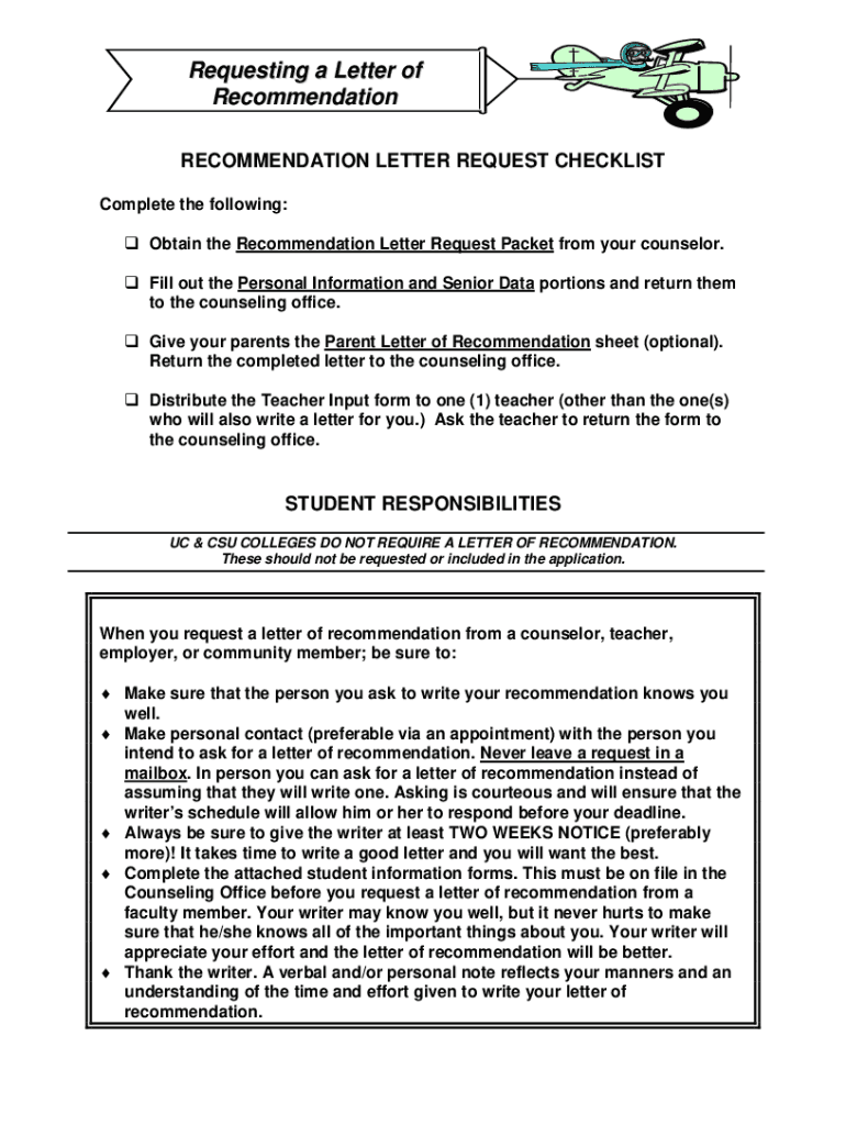 Requesting a Letter of Recommendation LETTER REQUEST CHECKLIST Complete the following: Obtain the Recommendation Letter Request Packet from your counselor. Fill out the Personal Information and Senior