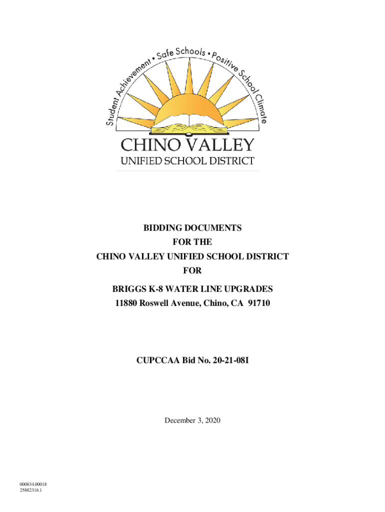 BIDDING DOCUMENTS FOR THE CHINO VALLEY UNIFIED SCHOOL DISTRICT FOR BRIGGS K8 WATER LINE UPGRADES 11880 Roswell Avenue, Chino, CA 91710CUPCCAA Bid No. 202108IDecember 3, 2020000834.00018 25882316.1THIS