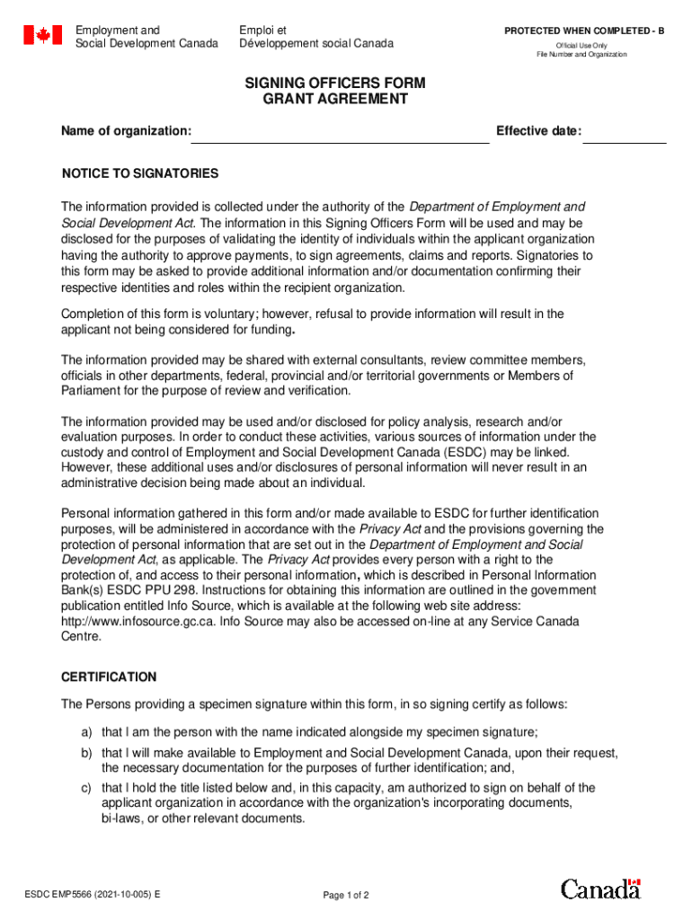 Employment and Social Development CanadaEmploi et Development social CanadaPROTECTED WHEN COMPLETED B Official Use Only File Number and OrganizationSIGNING OFFICERS FORM GRANT AGREEMENT Name of organization:Effective