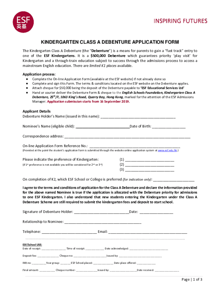 KINDERGARTEN CLASS A DEBENTURE APPLICATION From The Kindergarten Class A Debenture (the Debenture) is a means for parents to gain a fast track entry to one of the ESF Kindergartens. It is a $500,000
