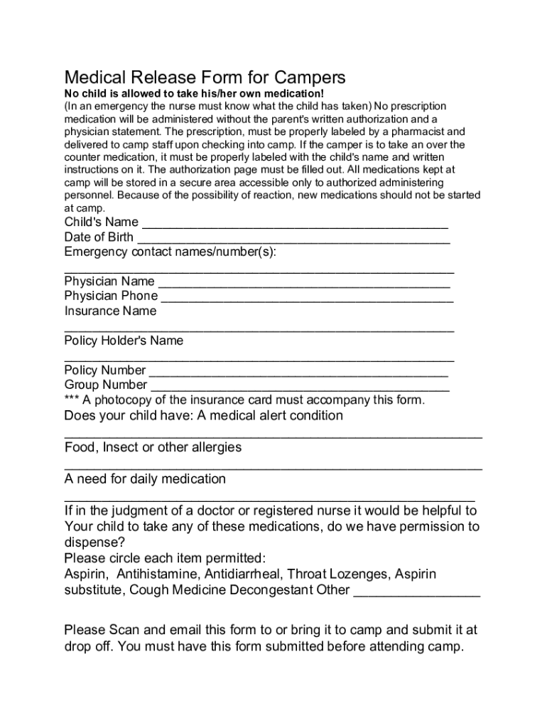 Medical Release Form for Campers No child is allowed to take his/her own medication! (In an emergency the nurse must know what the child has taken) No prescription medication will be administered