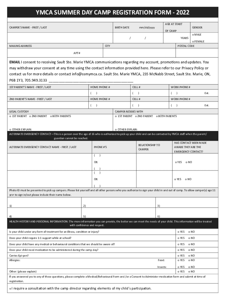 Get the free YMCA SUMMER DAY CAMP REGISTRATION FORM 2022 - ssmymca.ca