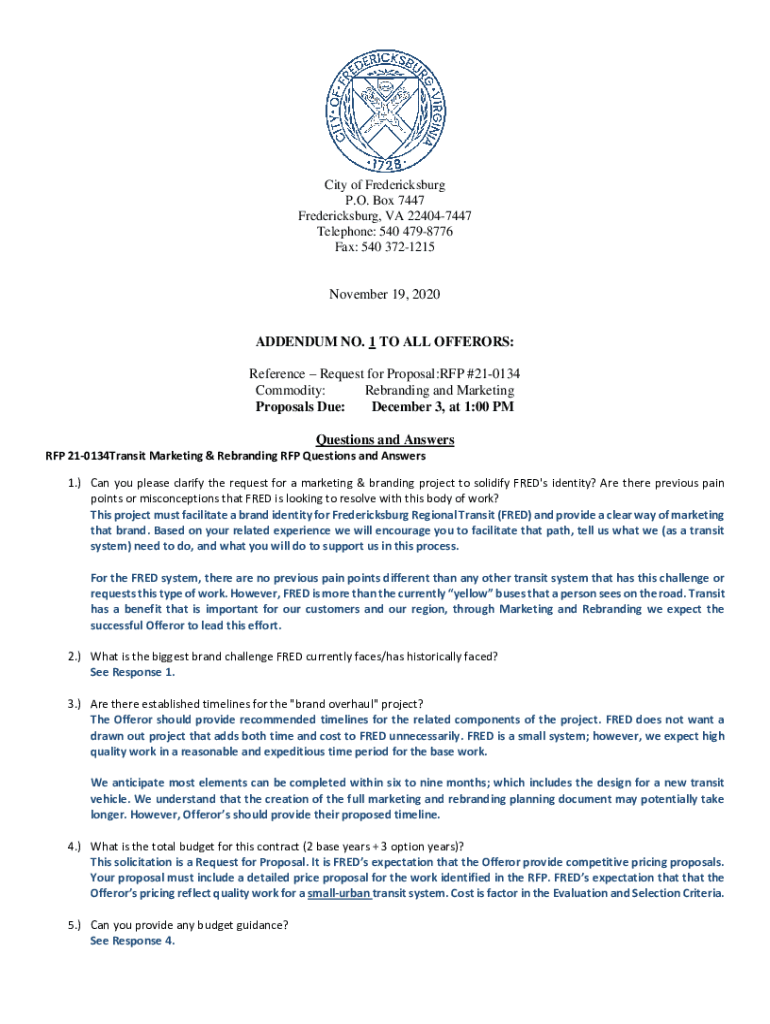 City of Fredericksburg P.O. Box 7447 Fredericksburg, VA 224047447 Telephone: 540 4798776 Fax: 540 3721215November 19, 2020 ADDENDUM NO. 1 TO ALL OFFER ORS: Reference Request for Proposal:RFP #210134