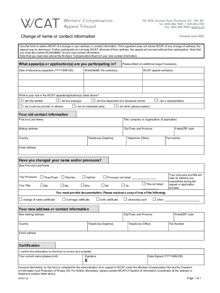 150, 4600 Jacobs Road, Richmond, B.C. V6V 3B1 Tel: (604) 6647800 | 18006632782 Fax: (604) 6647898 | what.bc.change of name or contact informationRevised June 2022Use this form to advise WHAT of a