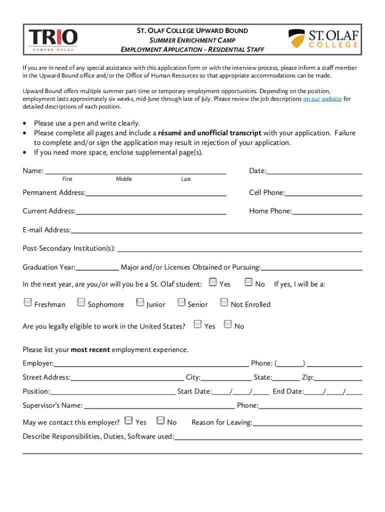 ST. OLAF COLLEGE UPWARD BOUND SUMMER ENRICHMENT CAMP EMPLOYMENT APPLICATION RESIDENTIAL STAFF If you are in need of any special assistance with this application form or with the interview process,
