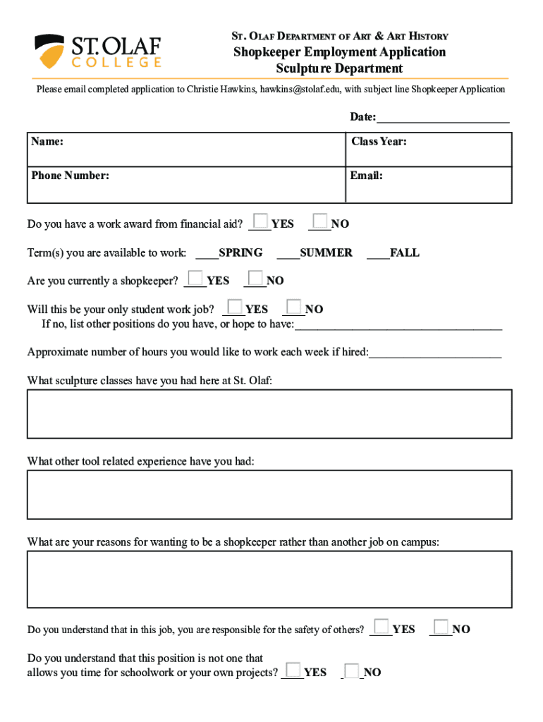 ST. OLAF DEPARTMENT OF ART & ART HISTORYShopkeeper Employment Application Sculpture DepartmentPlease email completed application to Christie Hawkins, hawkins@stolaf.edu, with subject line Shopkeeper