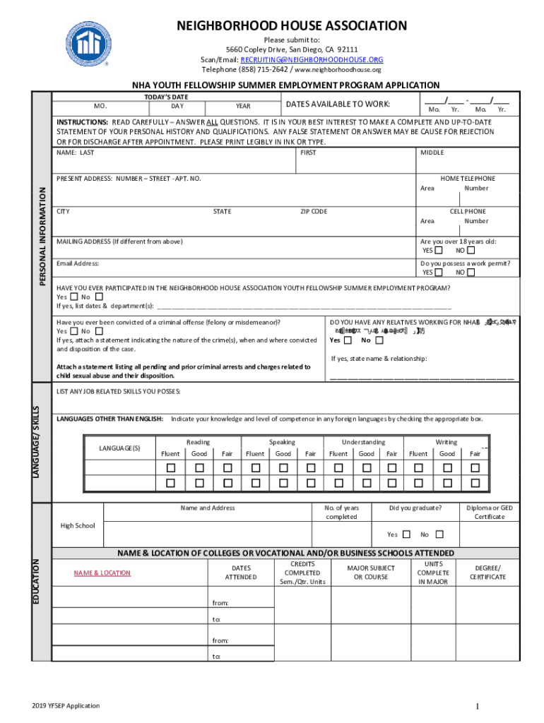 NEIGHBORHOODHOUSEASSOCIATION Pleasesubmitto: 5660CopleyDrive,San Diego,CA92111 Scan/Email:RECRUITING@NEIGHBORHOODHOUSE.ORG Telephone(858)7152642/www.neighborhoodhouse.orgNHAYOUTHFELLOWSHIPSUMMEREMPLOYMENTPROGRAMAPPLICATION