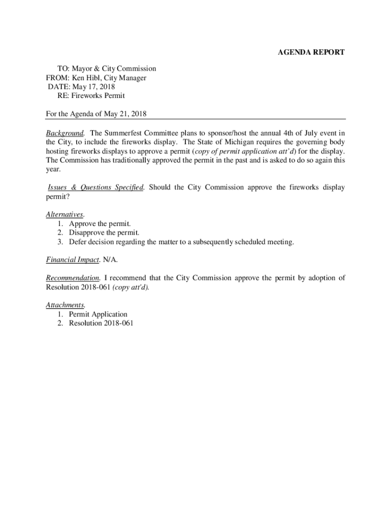 AGENDA REPORT TO: Mayor & City Commission FROM: Ken Hill, City Manager DATE: May 17, 2018, RE: Fireworks Permit For the Agenda of May 21, 2018, Background. The Summer fest Committee plans to sponsor/host