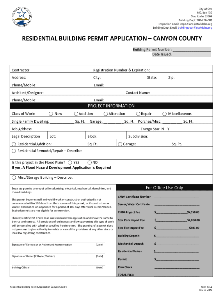 City of Star P.O. Box 130 Star, Idaho 83669 Building Dept: 208286007 Inspection Email: inspections@staridaho.org Building Dept Email: buildingdept@staridaho.orgRESIDENTIALBUILDINGPERMITAPPLICATIONCANYONCOUNTY
