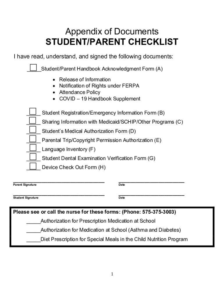 Appendix of Documents STUDENT/PARENT CHECKLIST I have read, understand, and signed the following documents: ___Student/Parent Handbook Acknowledgment Form (A) Release of Information Notification of