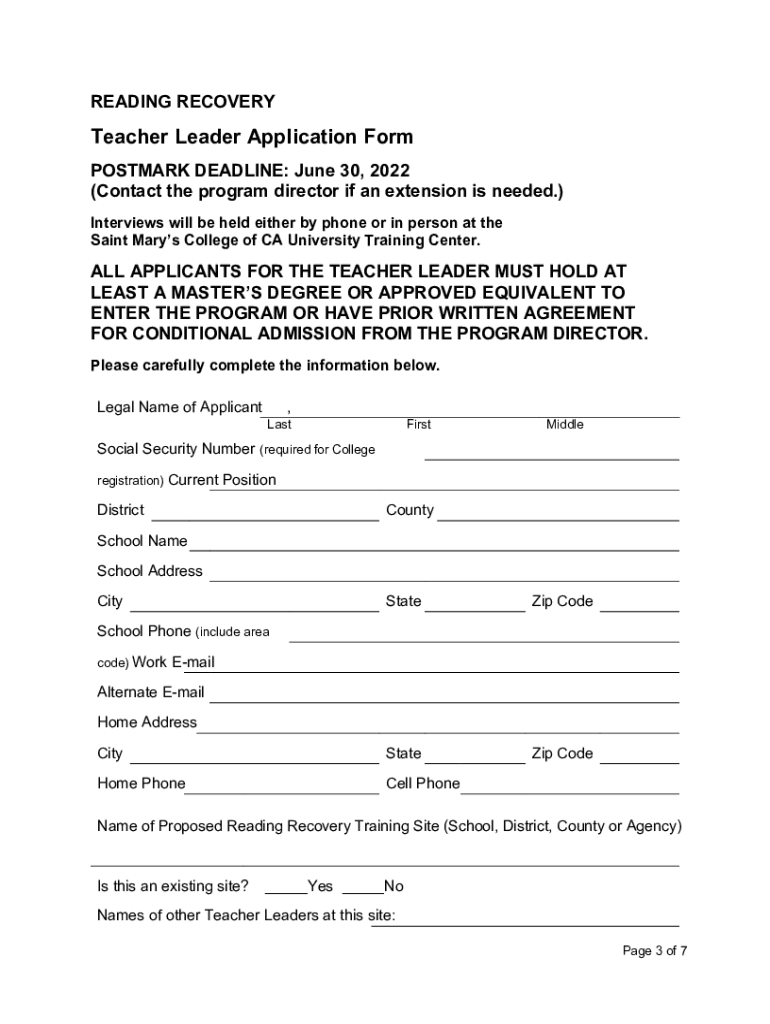 Reading RecoverySaint Mary's College of California University Training Center 20222023 Teacher Leader Application Form Send Application and Teacher Leader Training Commitment Form to: Saint Mary's