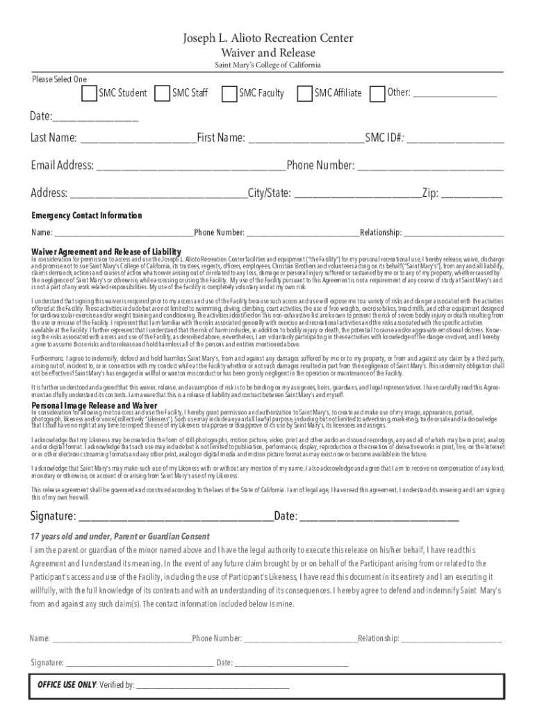 Joseph L. Alioth Recreation Center Waiver and Release Saint Mary's College of CaliforniaPlease Select One SMC Student SMC Staff SMC Faculty SMC AffiliateOther: ___Date:___ Last Name: ___First Name: