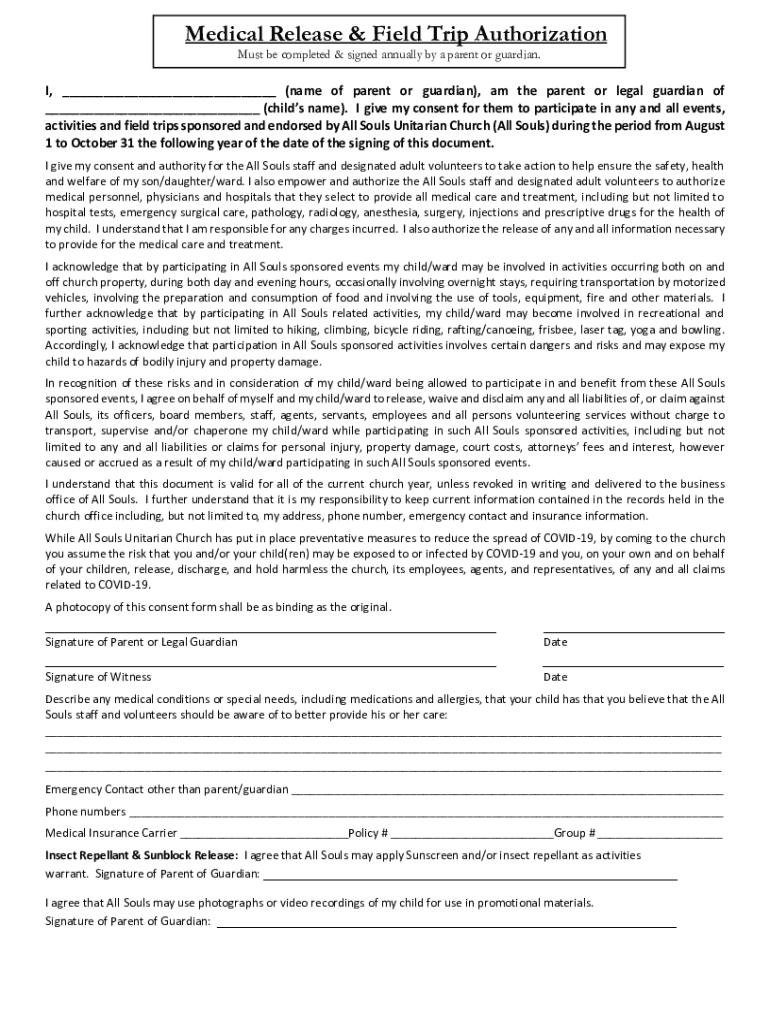 Submit the completed forms to the appropriate office or individual at All Souls Church Unitarian.