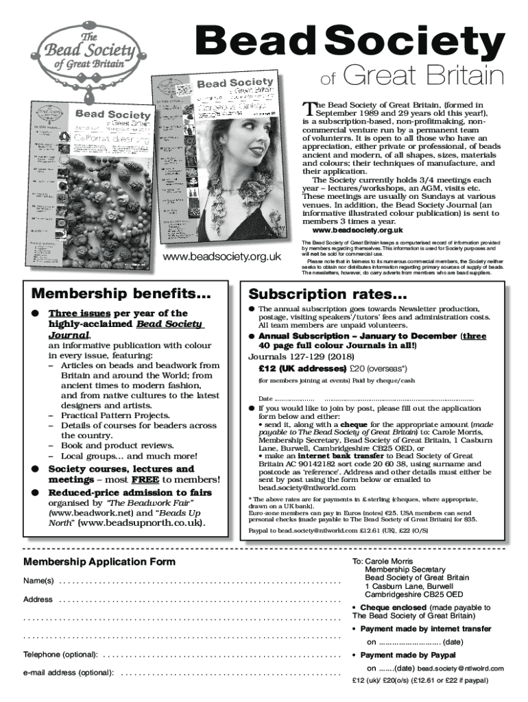 Bead SocietyTheBead Society of Great BritainofGreat Britain Bead Society of Great Britain, (formed in September 1989 and 29 years old this year!), is a subscription based, nonprofit making, noncommercial