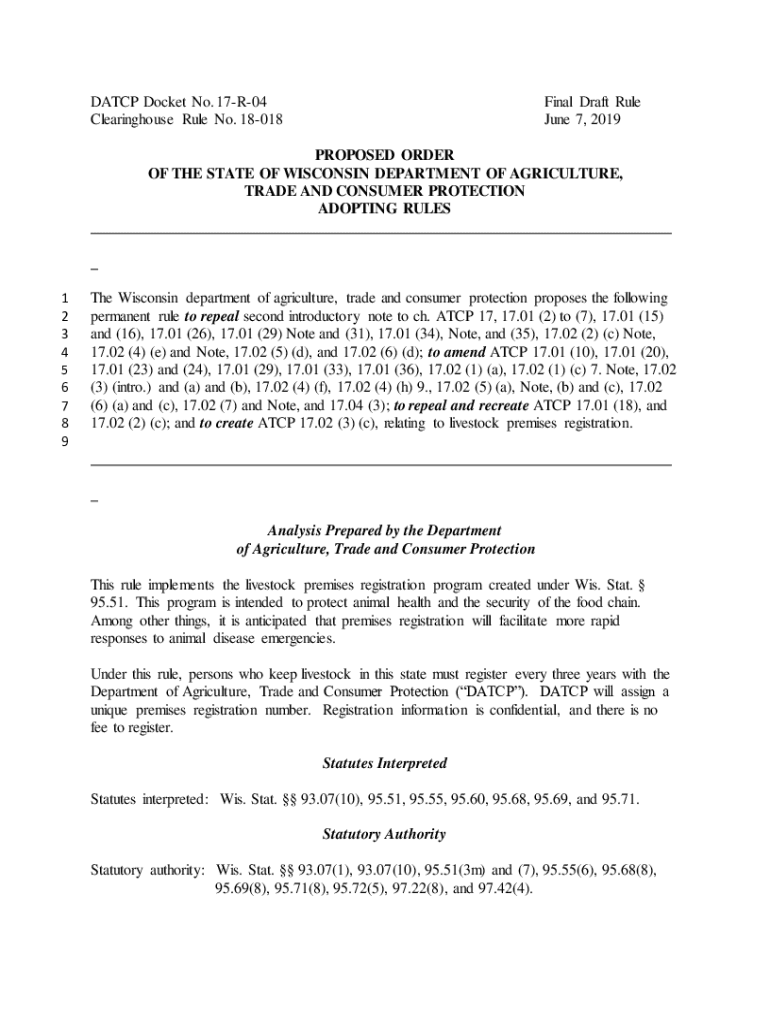 DATCP Docket No. 17-R-04 Final refers to a specific administrative rule or regulation finalized by the Wisconsin Department of Agriculture, Trade and Consumer Protection (DATCP) that pertains to agricultural practices or policies.