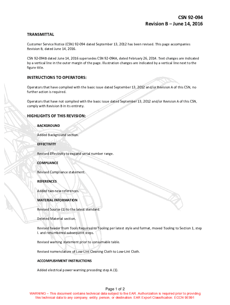 CAN 92094 Revision B June 14, 2016, TRANSMITTAL Customer Service Notice (CAN) 92094 dated September 13, 2012, has been revised. This page accompanies Revision B, dated June 14, 2016. CAN 92094B dated
