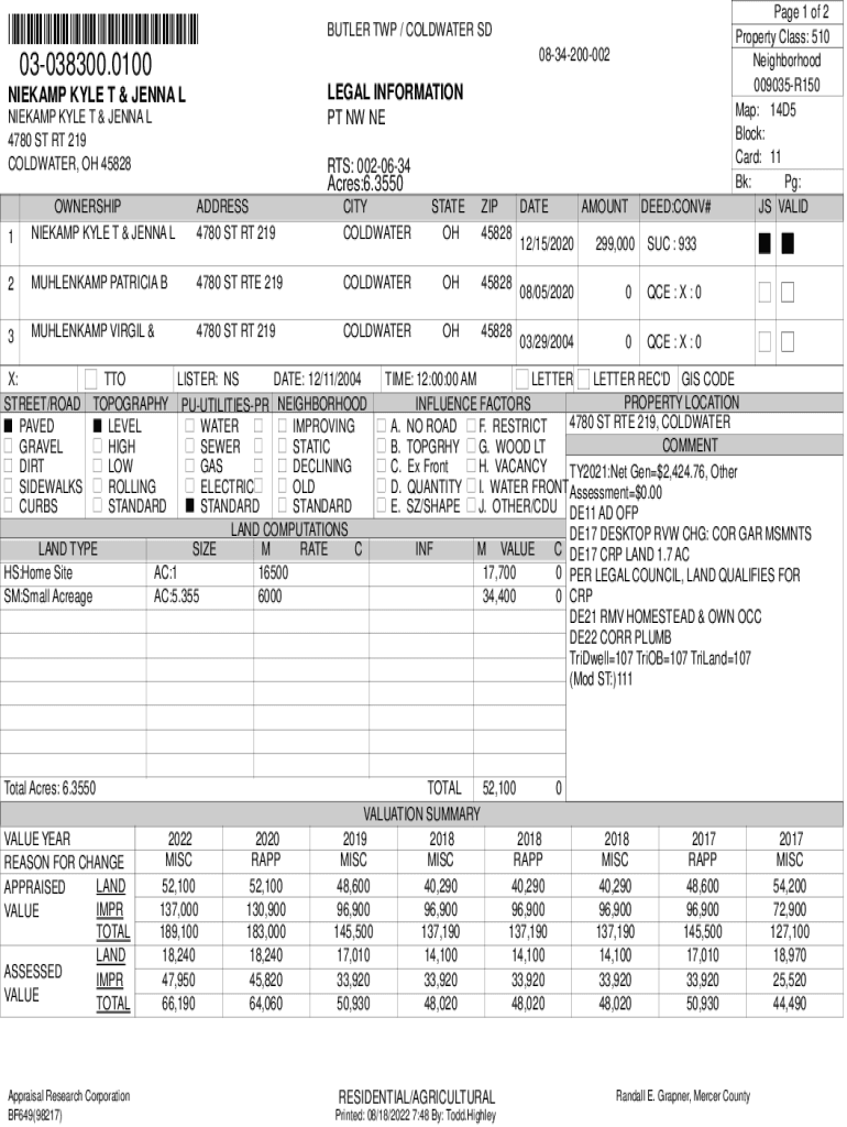 *030383000100×BUTLER TWP / GOLDWATER SDNIEKAMP KYLE T & JENNA LEGAL INFORMATIONNIEKAMP KYLE T & JENNA L 4780 ST RT 219 GOLDWATER, OH 45828PT NW NE083420000203038300.0100RTS: 0020634Acres:6.3550 1OWNERSHIP