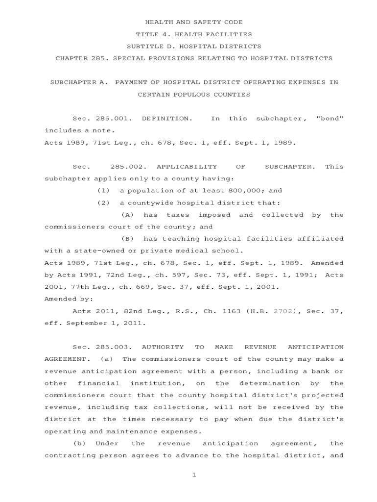 Get the free HEALTH AND SAFETY CODE CHAPTER 285. SPECIAL PROVISIONS RELATING TO HOSPITAL DISTRICTS