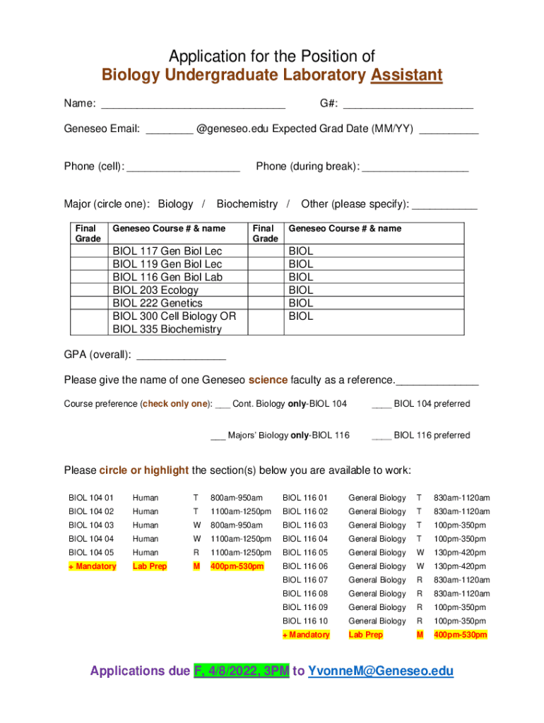 Application for the Position of Biology Undergraduate Laboratory Assistant Name: ___G#: ___Geneses Email: ___ geneses.edu Expected Grad Date (MM/BY) ___Phone (cell): ___Major (circle one): Biology