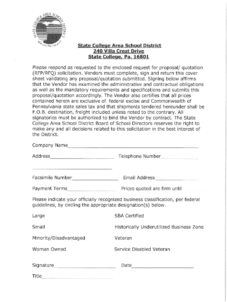 State College Area School District 240 Villa Crest Drive State College, Pa. 16801Please respond as requested to the enclosed request for proposal/ quotation (RFP/RFQ) solicitation. Vendors must complete,