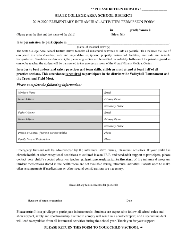 ** PLEASE RETURN FORM BY: ___STATE COLLEGE AREA SCHOOL DISTRICT 20192020 ELEMENTARY INTRAMURAL ACTIVITIES PERMISSION FORM ___in ___ grade/room #___ (Please print the first and last name of the child)(4th