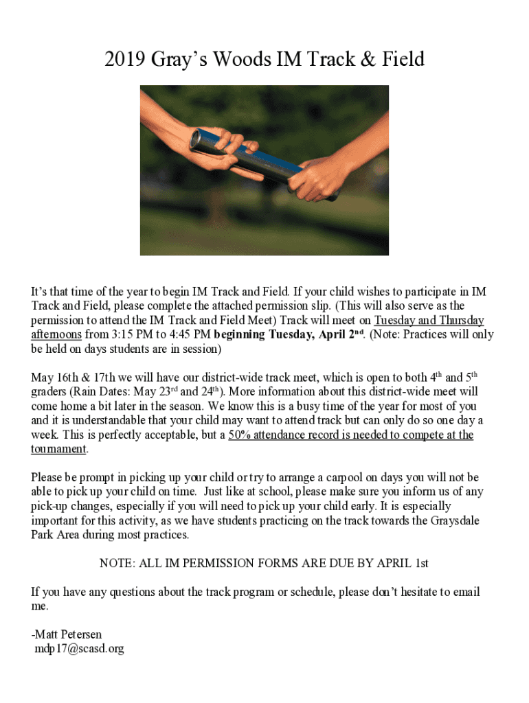 2019 Grays Woods I'm Track & Fields that time of the year to begin I'm Track and Field. If your child wishes to participate in I'm Track and Field, please complete the attached permission slip. (This