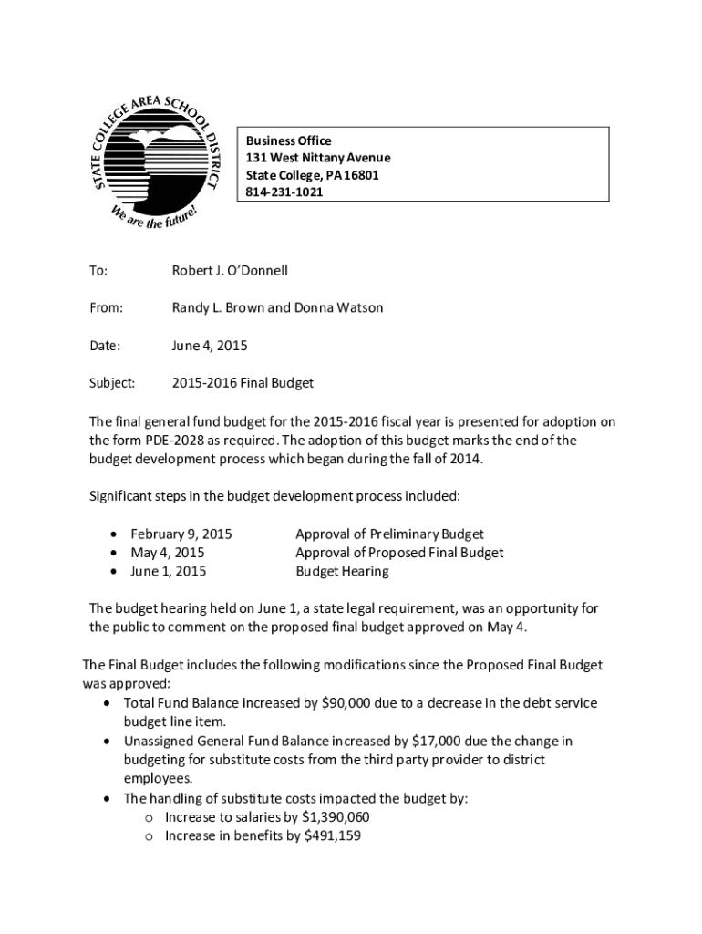8142311021To:Robert J. ODonnellFrom:Randy L. Brown and Donna WatsonDate:June 4, 2015Subject:20152016 Final Budget final general fund