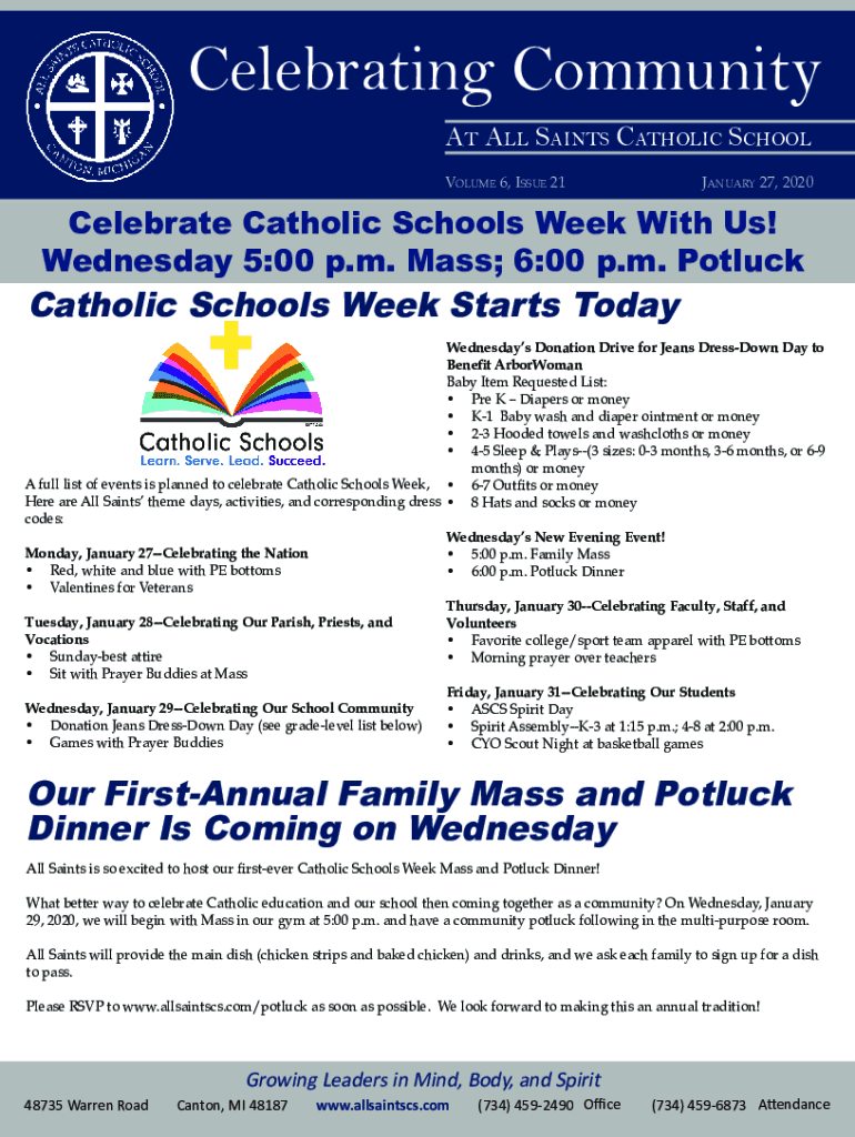 Celebrating Community At All Saints Catholic School January 27, 2020Volume 6, Issue 21Celebrate Catholic Schools Week With Us! Wednesday 5:00 p.m. Mass; 6:00 p.m. Potluck Catholic Schools Week Starts