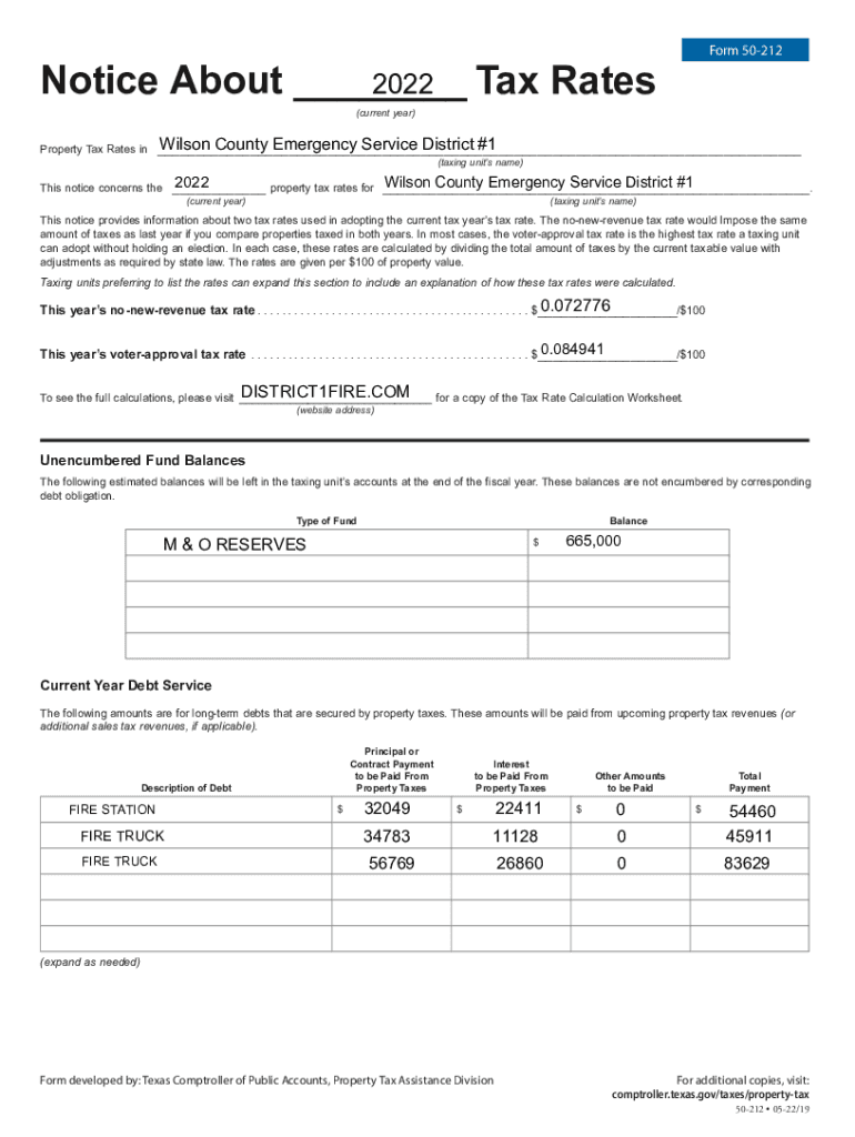 Form 50212Notice About ___ 2022 Tax Rates (current year)Property Tax Rates in Wilson County Emergency Service District #1 ___ (taxing units name)2022 ___This notice concerns the(current year)property