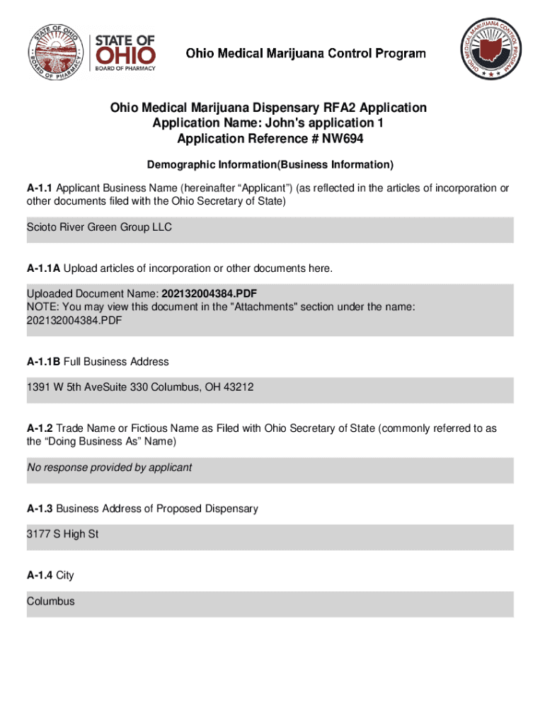 Ohio Medical Marijuana Dispensary RFA2 Application Name: John\'s application 1 Application Reference # NW694 Demographic Information(Business Information) A1.1 Applicant Business Name (hereinafter