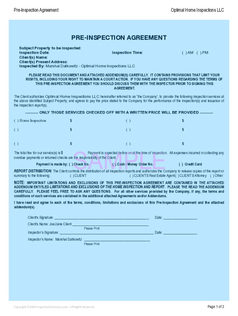 Inspection AgreementOptimal Home Inspections LLCPREINSPECTION AGREEMENT Subject Property to be Inspected: Inspection Date: Inspection Time: Client(s) Name: Client(s) Present Address: Inspected By: