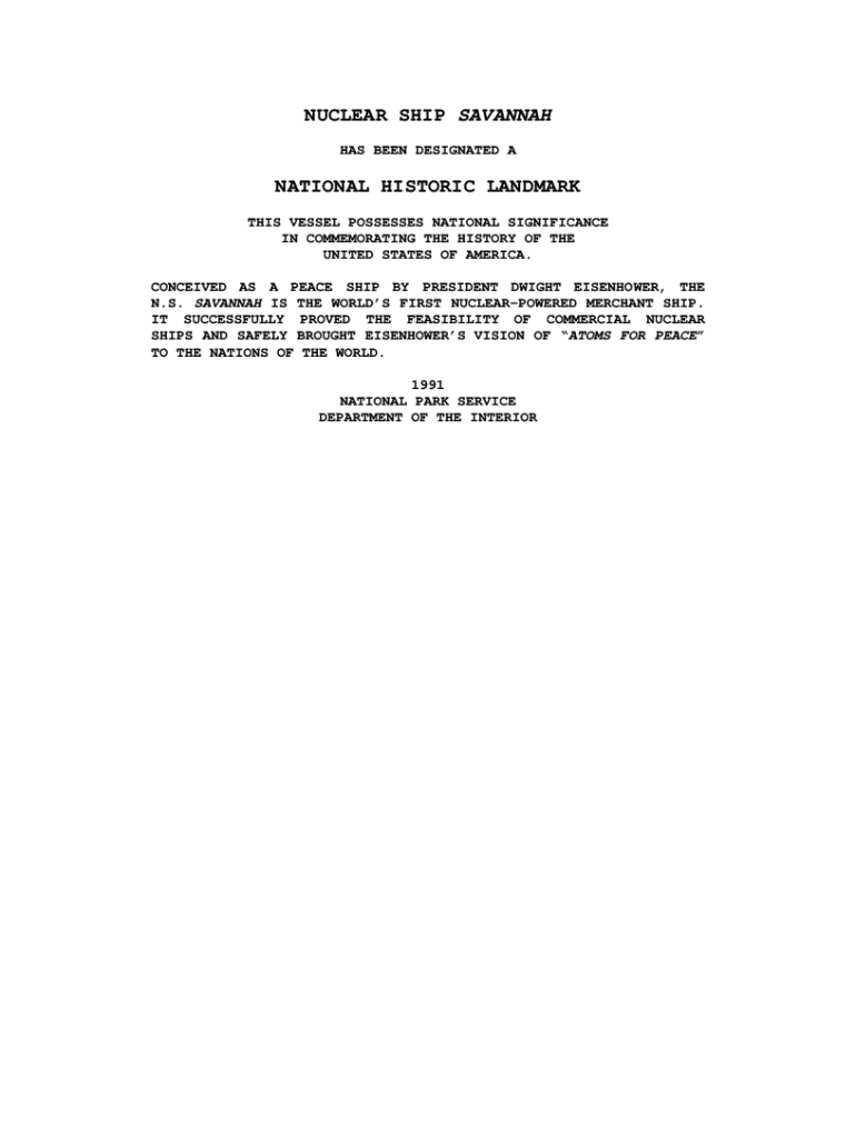 NUCLEAR SHIP SAVANNAH HAS BEEN DESIGNATED NATIONAL HISTORIC LANDMARK THIS VESSEL POSSESSES NATIONAL SIGNIFICANCE IN COMMEMORATING THE HISTORY OF THE UNITED STATES OF AMERICA. CONCEIVED AS A PEACE