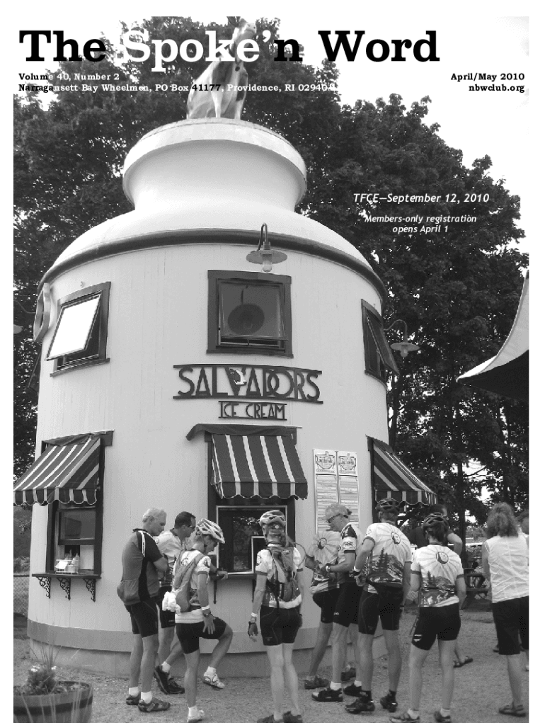 The Spoken Word Volume 40, Number 2 Narragansett Bay Wheelmen, PO Box 41177, Providence, RI 029401177April/May 2010 club.orgTFCESeptember 12, 2010 Members only registration opens April 1SUPER CYCLE