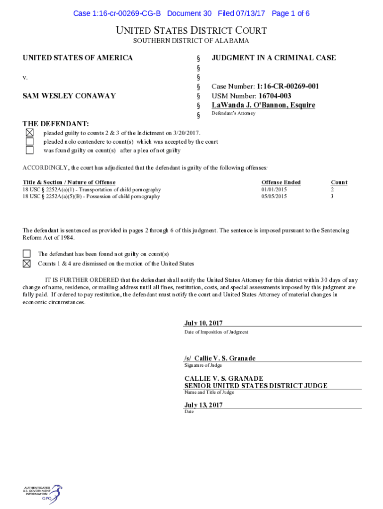 Case 1:16cr00269CGB Document 30 Filed 07/13/17-Page 1 of 6UNITED STATES DISTRICT COURT SOUTHERN DISTRICT OF ALABAMA UNITED STATES OF AMERICA v. SAM WESLEY CONAWAYJUDGMENT IN A CRIMINAL CASE Number: