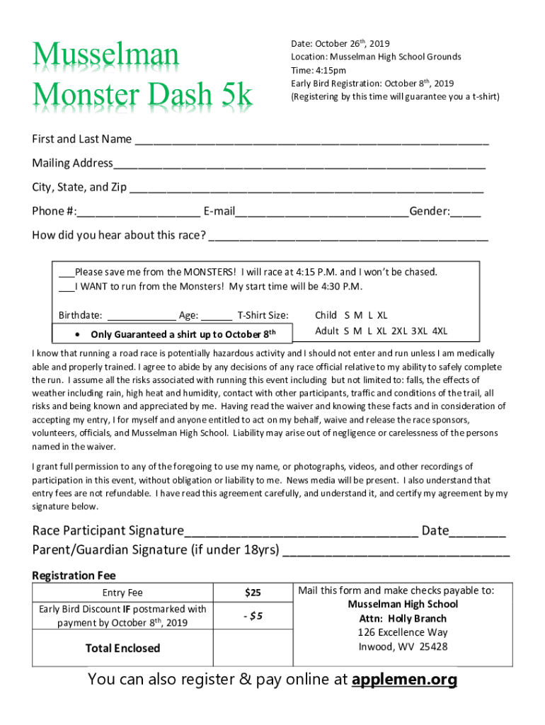 Mussel man Monster Dash 5kDate: October 26th, 2019 Location: Mussel man High School Grounds Time: 4:15pm Early Bird Registration: October 8th, 2019 (Registering by this time will guarantee you a shirt)First