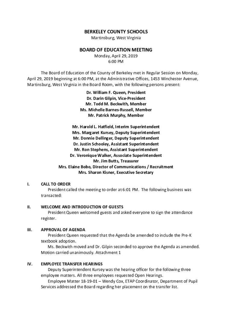 BERKELEY COUNTY SCHOOLS Martinsburg, West VirginiaBOARD OF EDUCATION MEETING Monday, April 29, 2019 6:00 PMT he Boards of Education of the County of Berkeley met in Regular Session on Monday, April