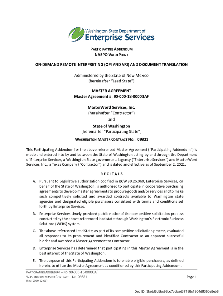 PARTICIPATING ADDENDUM NAS PO BLUEPOINT ON-DEMAND REMOTE INTERPRETING (OPI AND VRI) AND DOCUMENT TRANSLATION Administered by the State of New Mexico (hereinafter Lead State) MASTER AGREEMENT #: 900001800003AF