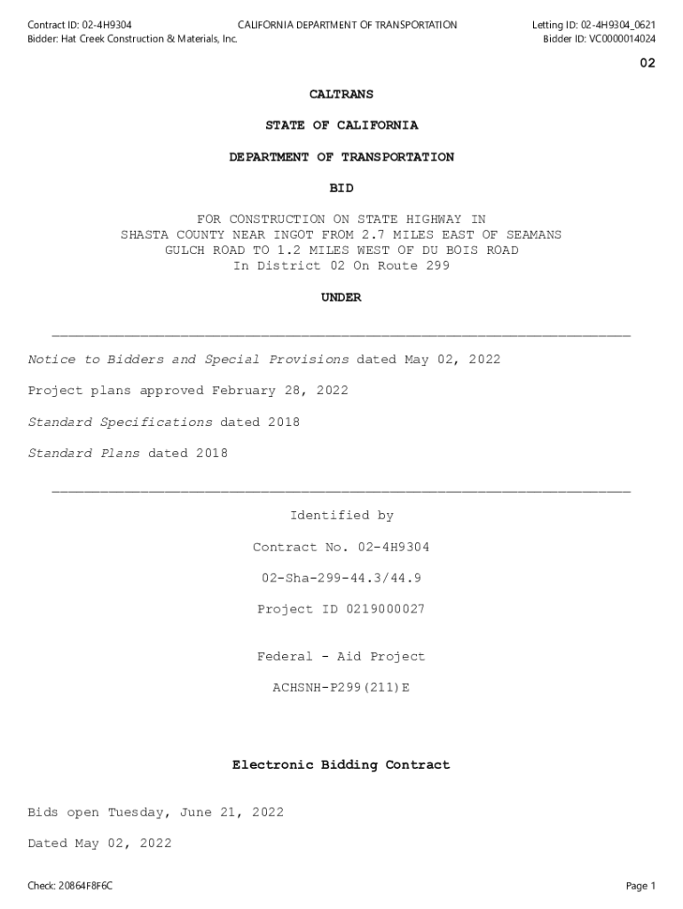Contract ID: 024H9304 CALIFORNIA DEPARTMENT OF TRANSPORTATION Bidder: Hat Creek Construction & Materials, Inc. Letting ID: 024H9304_0621 Bidder ID: VC000001402402 COLTRANE STATE OF CALIFORNIA DEPARTMENT