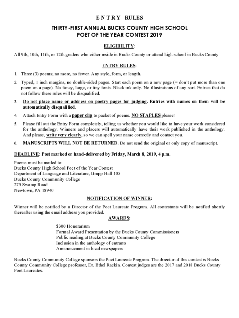 E N T R Y RULES THIRTYFIRST ANNUAL BUCKS COUNTY HIGH SCHOOL POET OF THE YEAR CONTEST 2019 ELIGIBILITY: All 9th, 10th, 11th, or 12th graders who either reside in Bucks County or attend high school