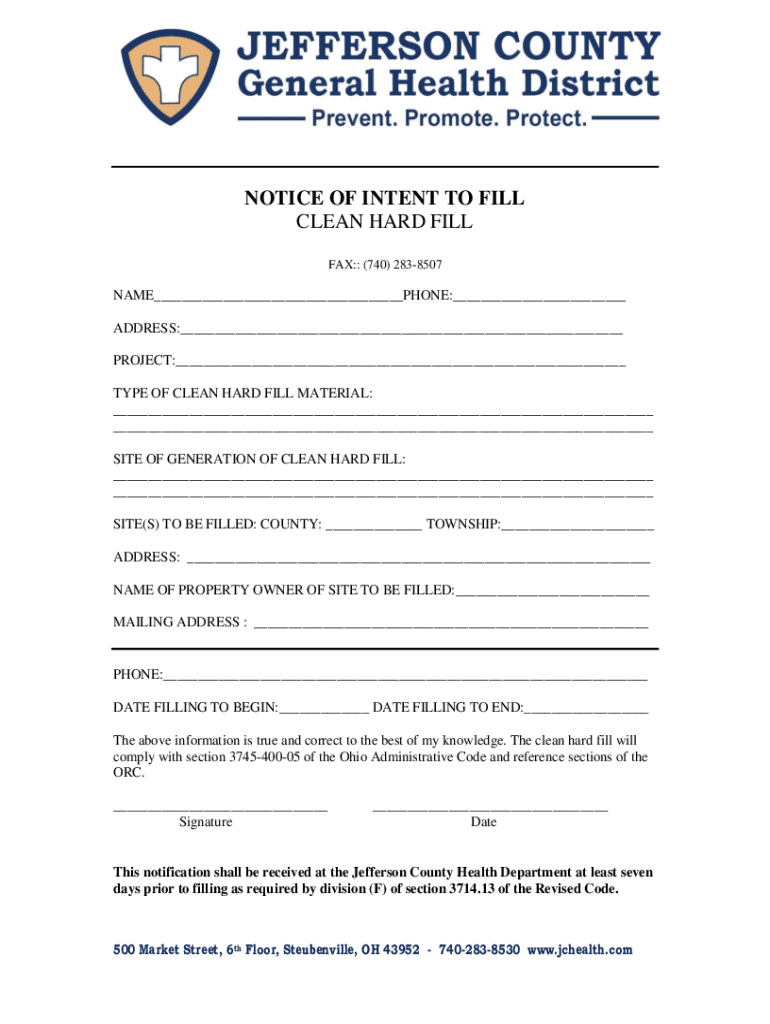 NOTICE OF INTENT TO FILL CLEAN HARD FILL FAX:: (740) 2838507NAME___PHONE:___ ADDRESS:___ PROJECT:___ TYPE OF CLEAN HARD FILL MATERIAL: ___ ___ SITE OF GENERATION OF CLEAN HARD FILL: ___ ___ SITE(S)